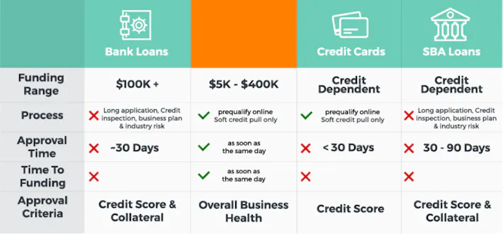 Faster and more flexible than a traditional bank loan, but with a level of transparency and support that makes us a leader in the alternative lending industry. We’ve made prequalifying for business financing extremely quick and easy. There are no submission fees and you can typically expect your funds within 48 hours of approval.